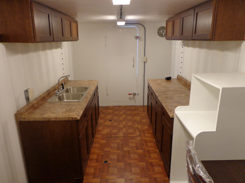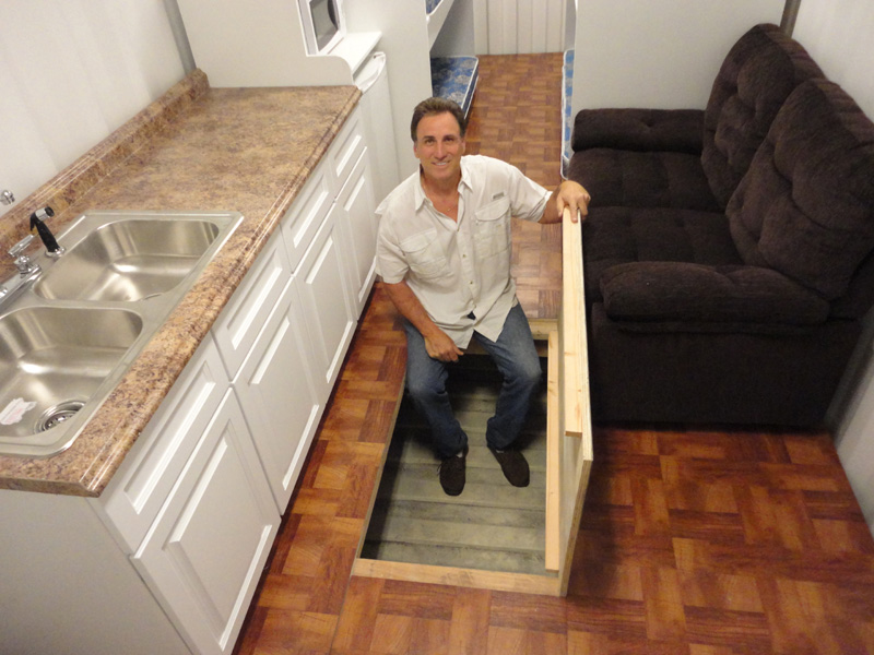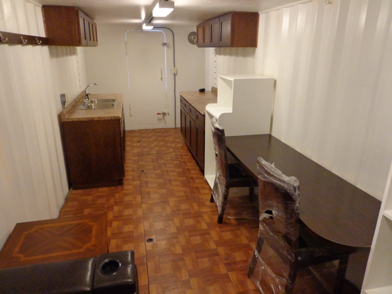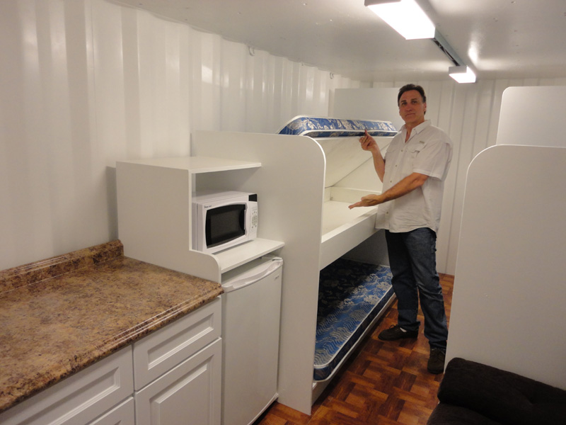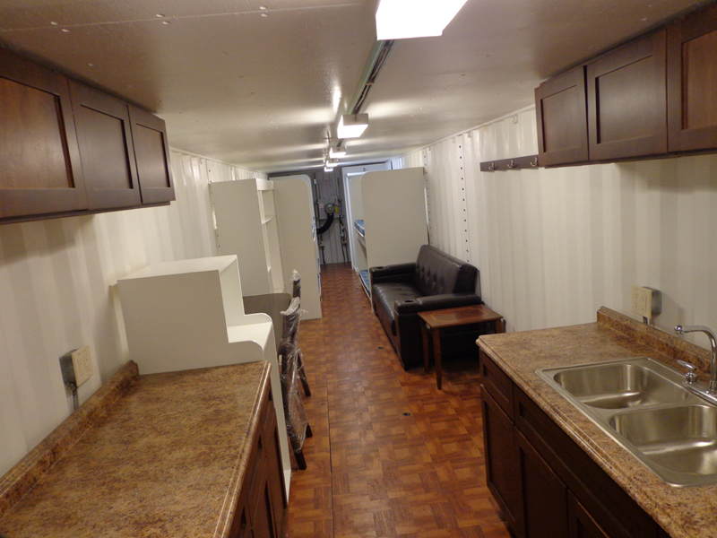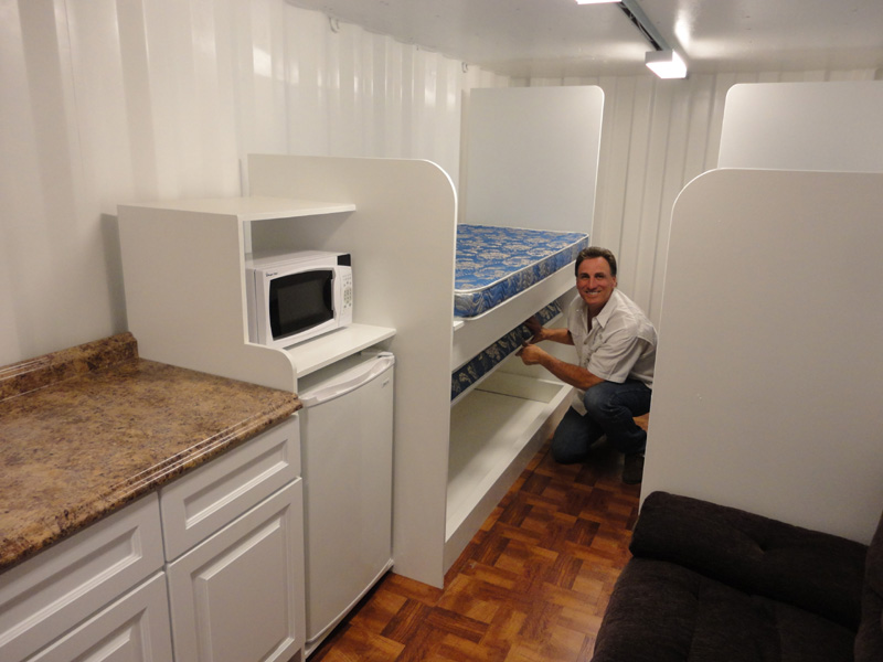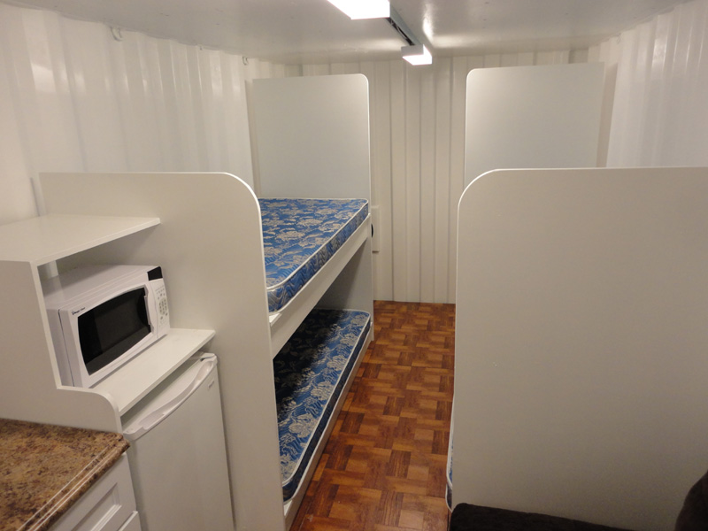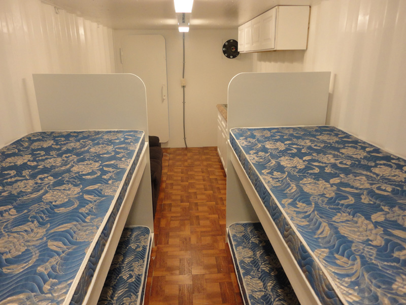 | This is a 10'6" x 40' High Cube shipping container converted into an underground home. The Hunters Den features 8 bunk beds, toilet room, entertainment center with with 46" flat flat screen TV, couch, 76" long dinner table, 2- 72" kitchen counters with sink ,refrigerators, microwave, overhead cupboards, gun rack area and wall space to hang up camo after hunting. This shelter has a "massive amount of storage" underneath the floor, 36" deep for 55 gallon drums. Deer hunters may want to consider using the shelter as an above-ground deer camp until they bury their shelter. |