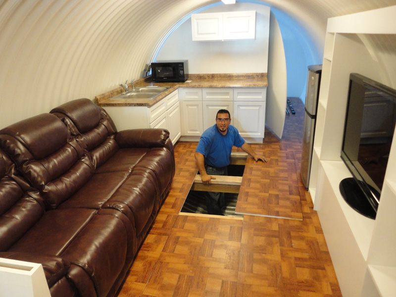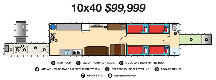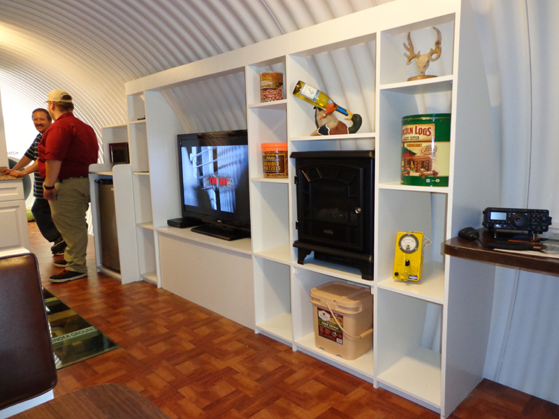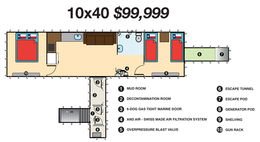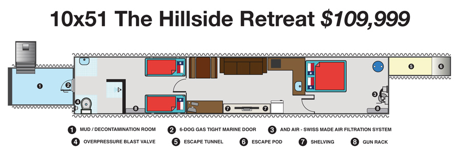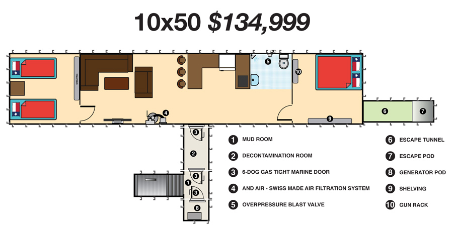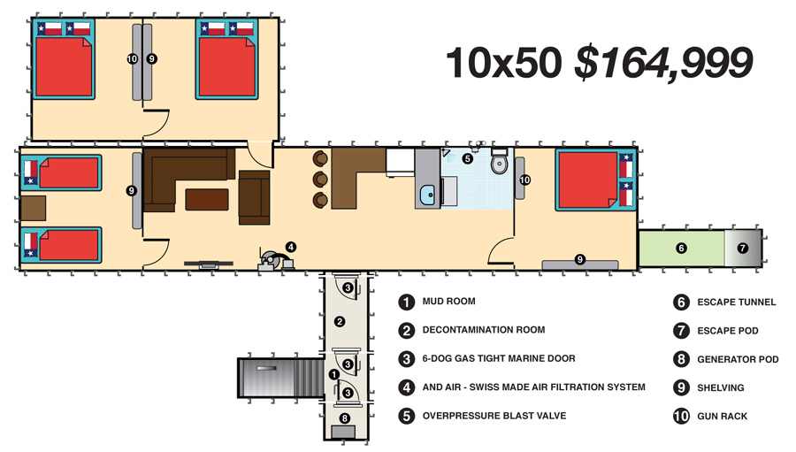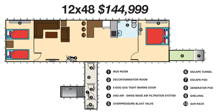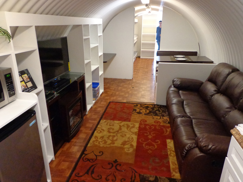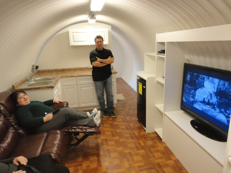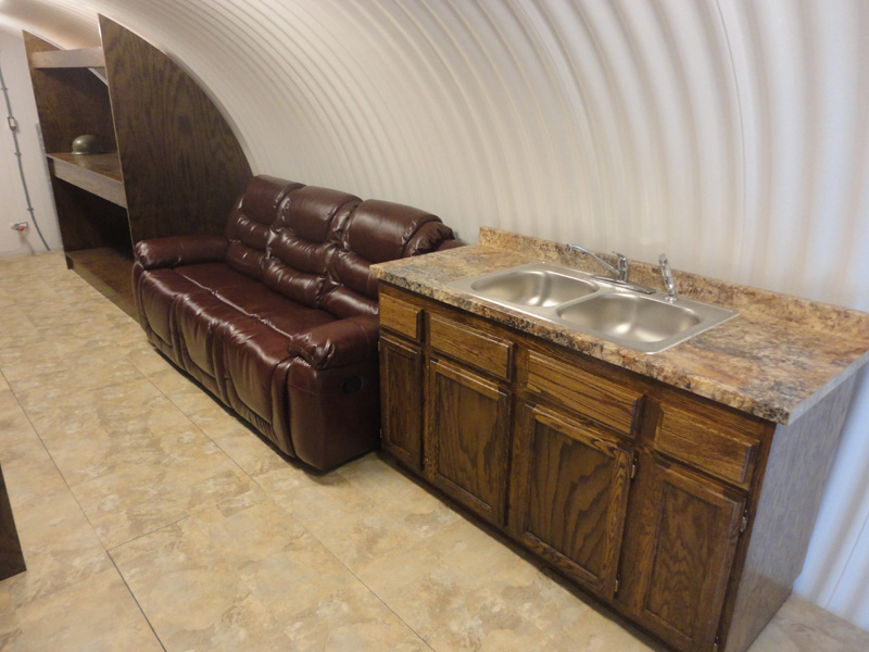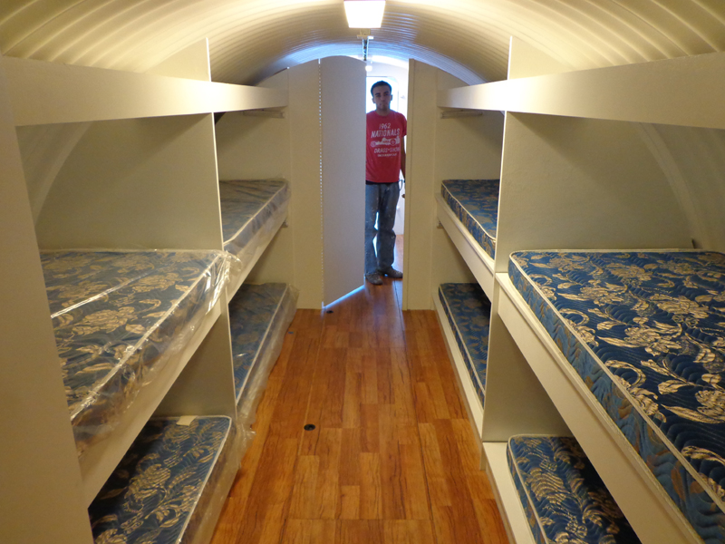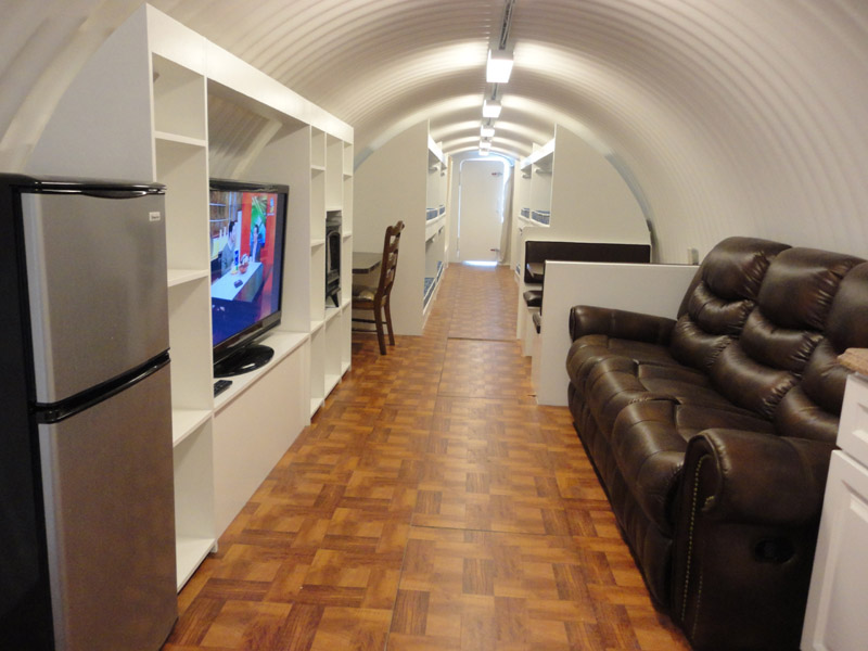 This is our most popular stock model, the 10' x 50' underground home. It has a master bedroom with a Queen size bed on one end and 8-10 bunk beds on the opposite end of the shelter with shower and toilet. In the middle is a spacious den with a 4 person fixed dinner table, 48" desk and a reclining couch and entertainment center with 46" big screen tv. Also it has a large kitchen with cabinets, sink, full size refrigerator and microwave. Custom Floor plans available..