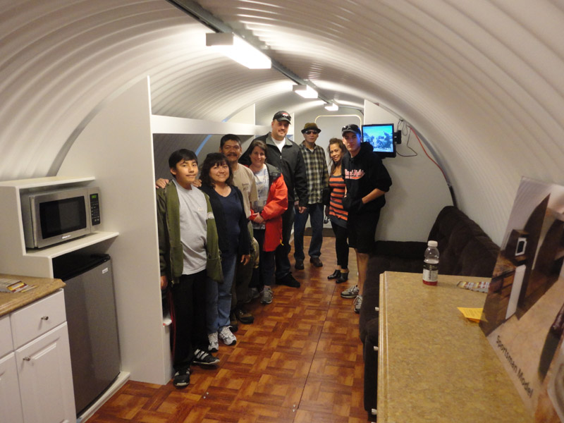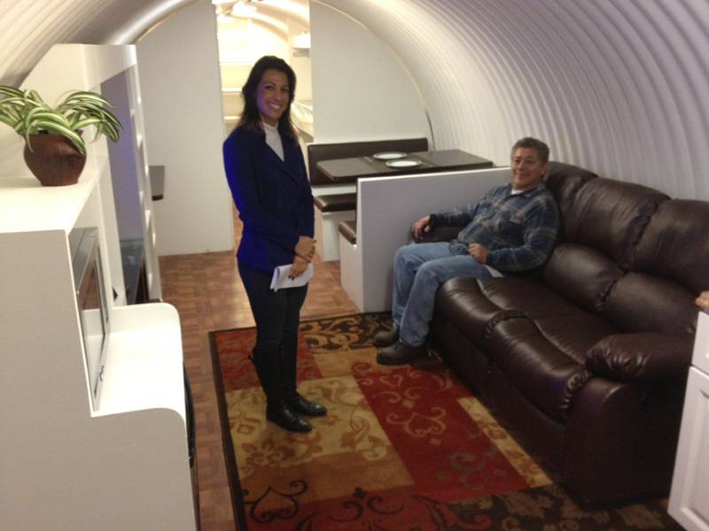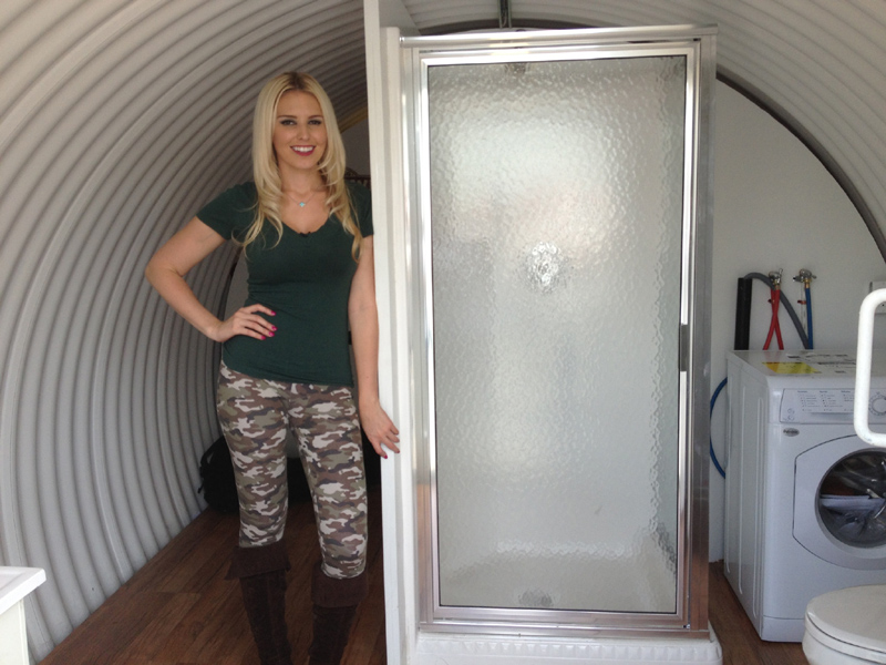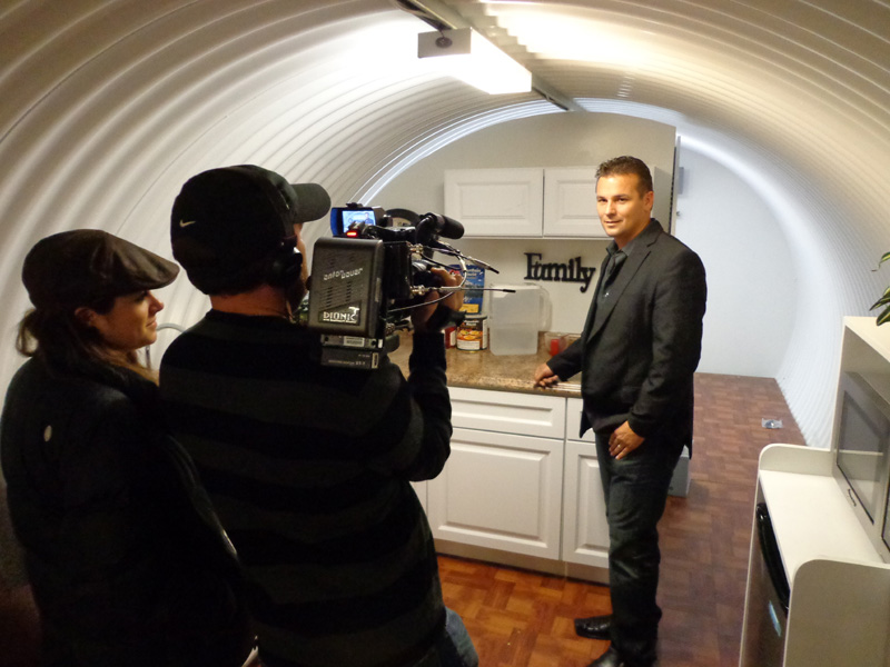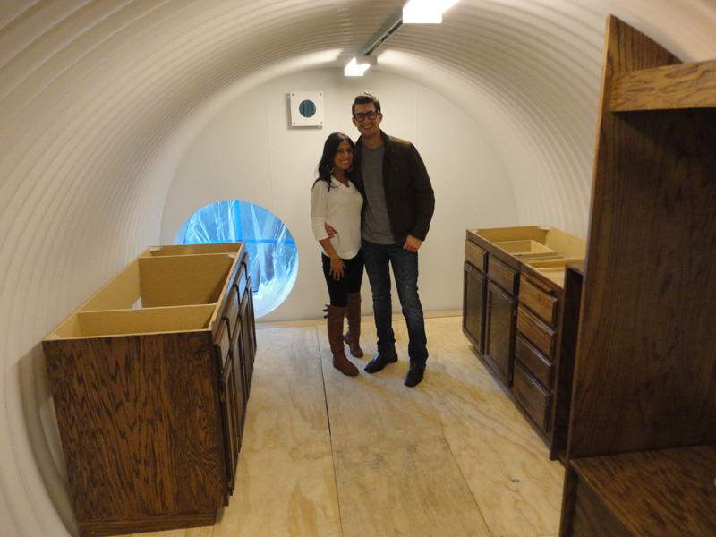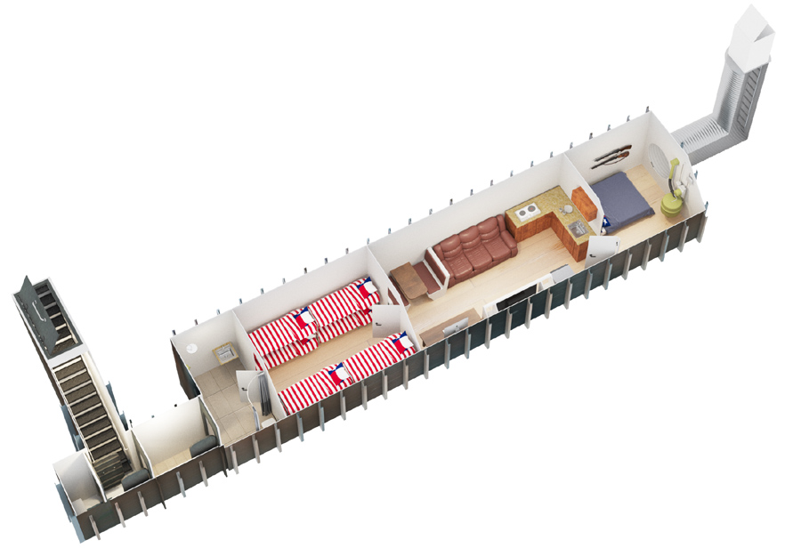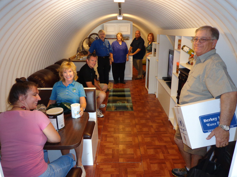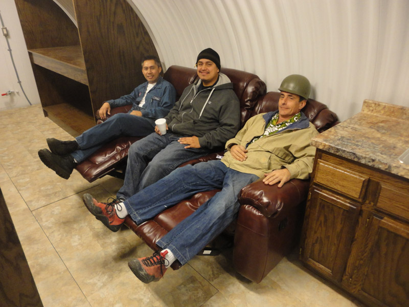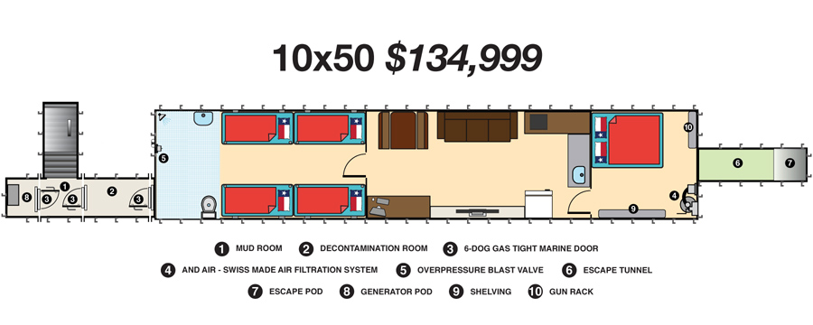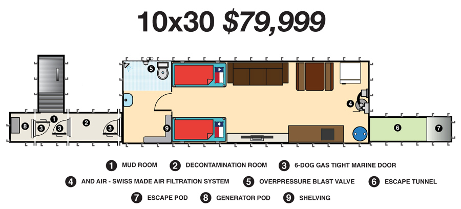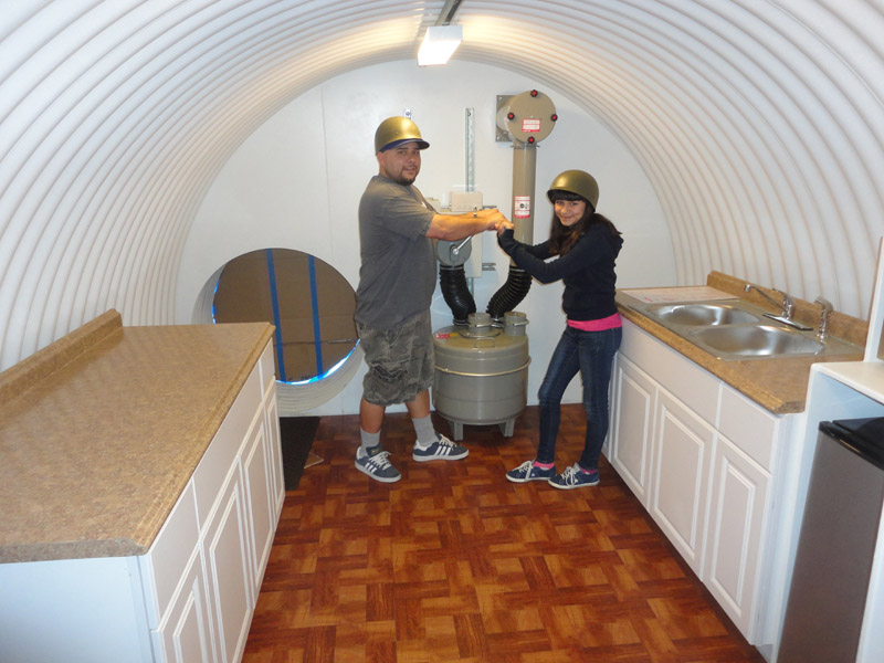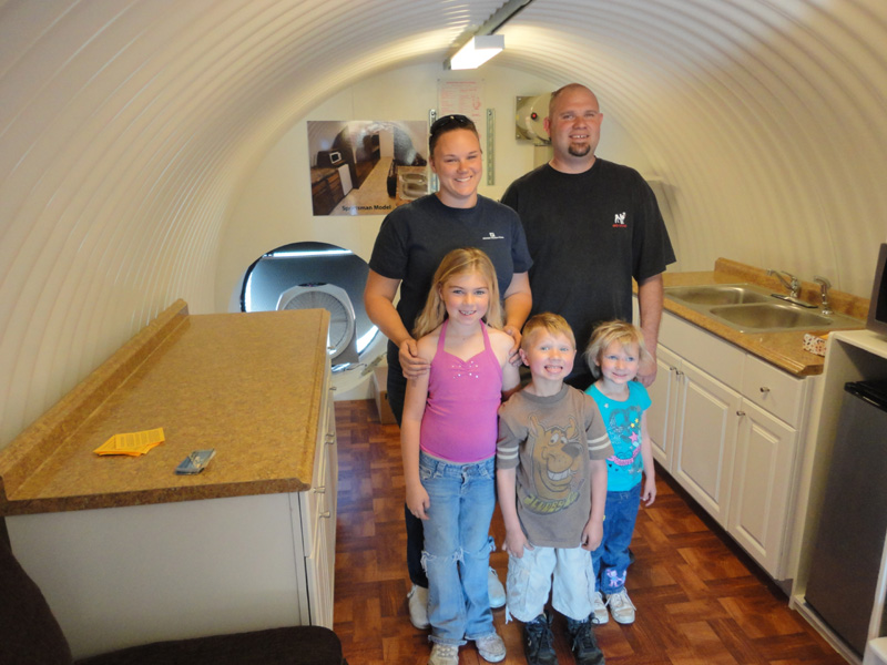 This is our most popular stock model, the 10' x 50' underground home. It has a master bedroom with a Queen size bed on one end and 8-10 bunk beds on the opposite end of the shelter with shower and toilet. In the middle is a spacious den with a 4 person fixed dinner table, 48" desk and a reclining couch and entertainment center with 46" big screen tv. Also it has a large kitchen with cabinets, sink, full size refrigerator and microwave. Custom Floor plans available..