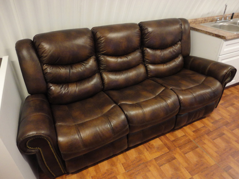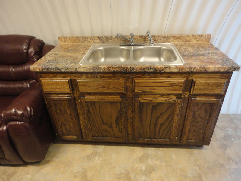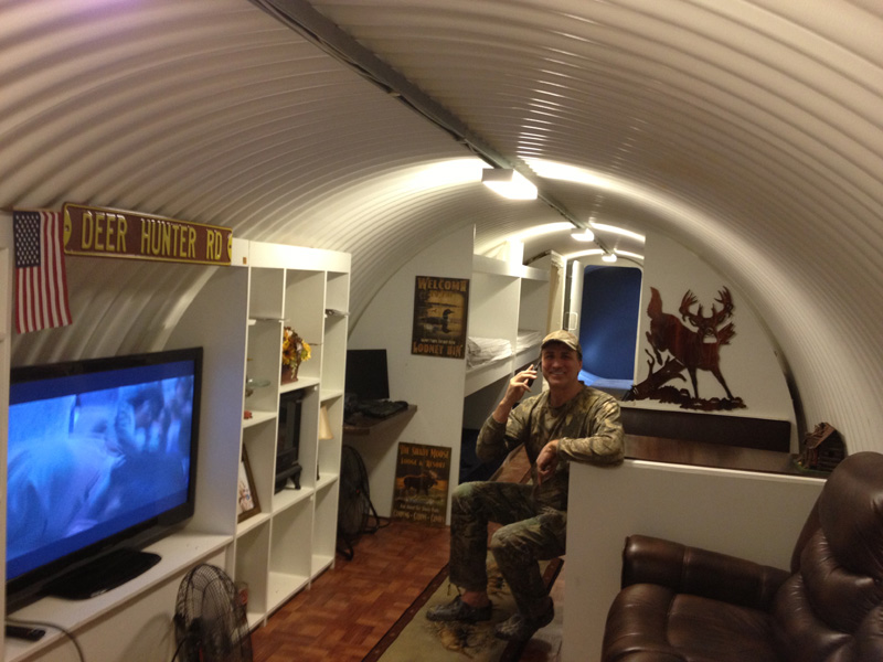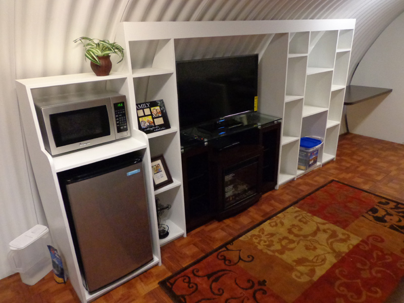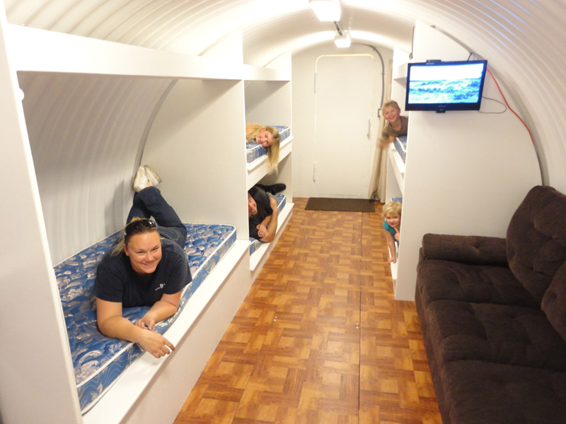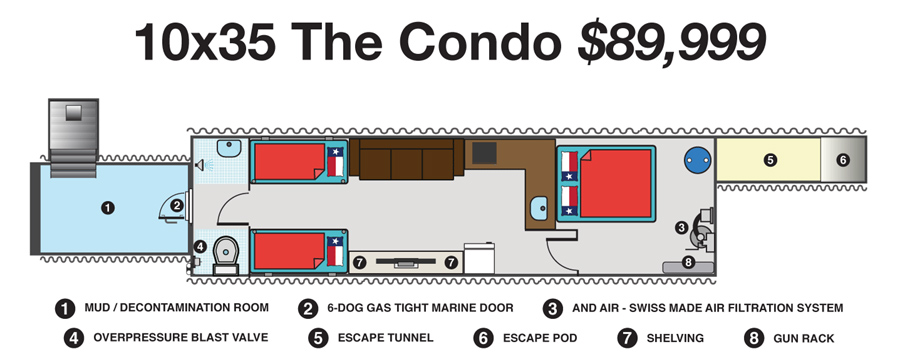 This is our popular 10' x 32' underground condo. It has a master bedroom with a Queen size bed on one end and four bunk beds on the opposite end of the shelter with toilet. In the middle is a spacious den with a reclining couch and entertainment center with 46" big screen tv. Also it has a large kitchen with cabinets, sink, refrigerator and microwave. Custom Floor plans available.