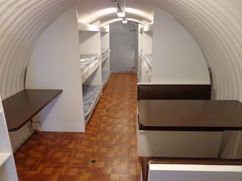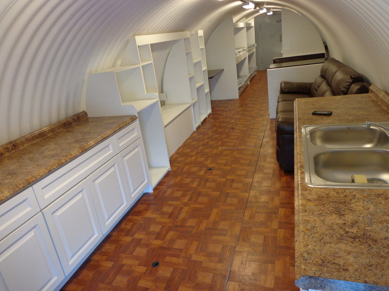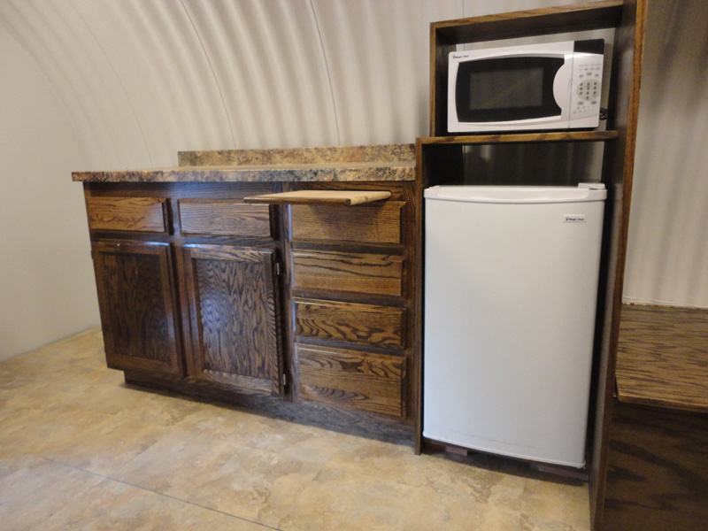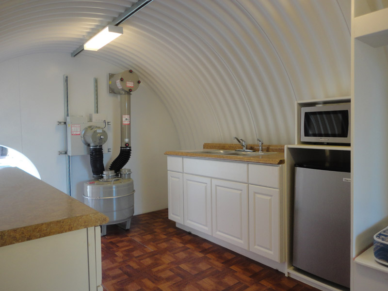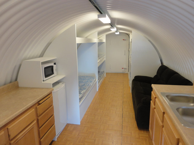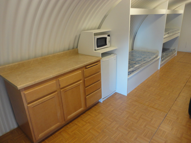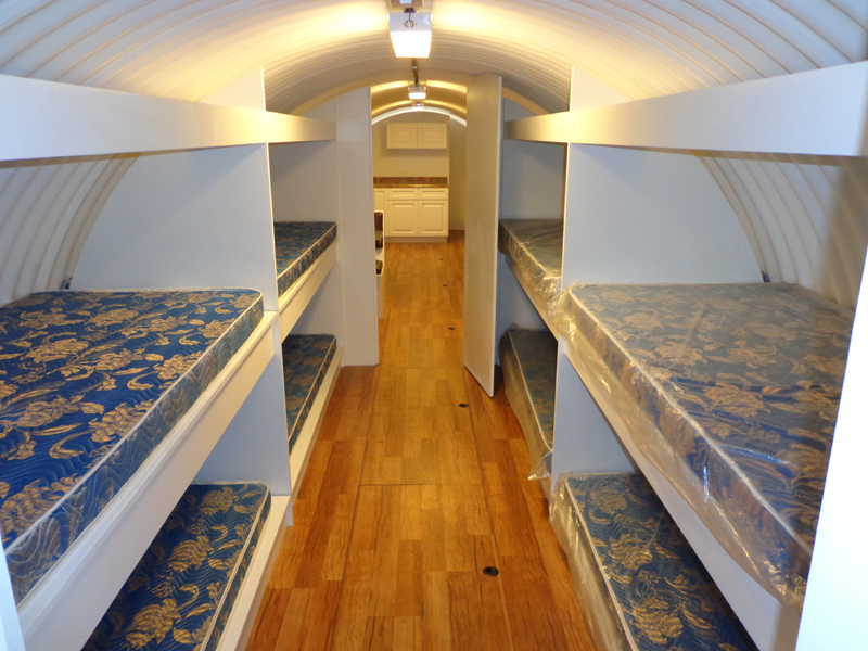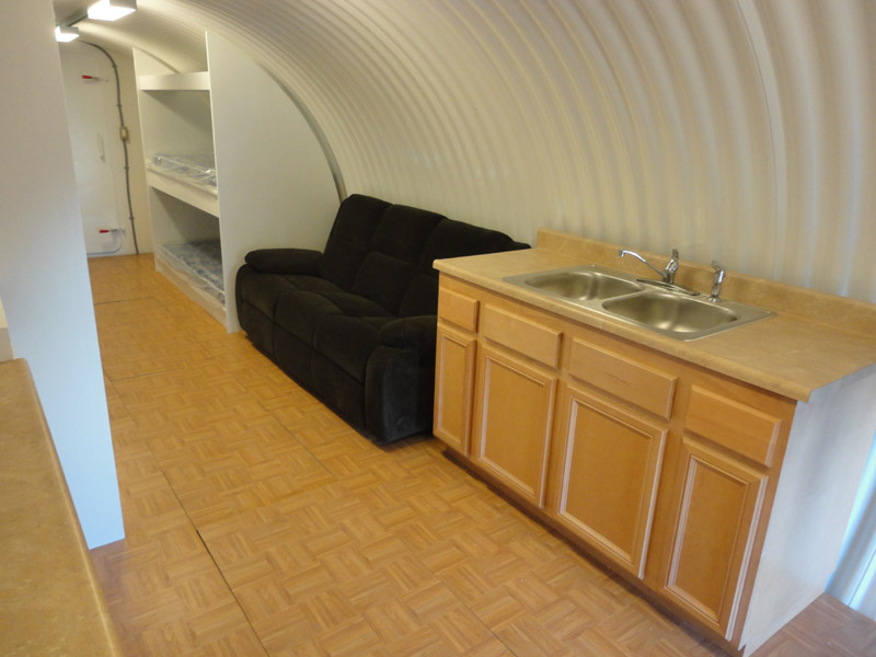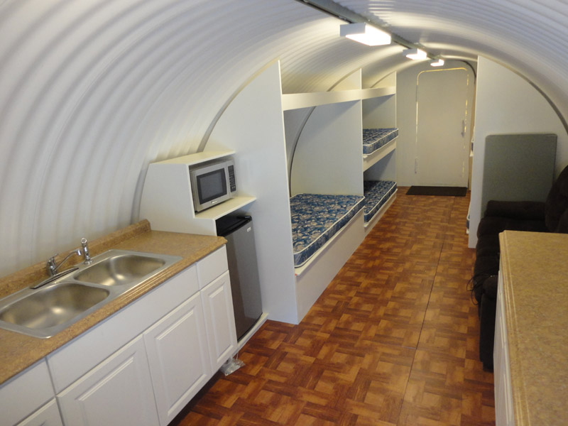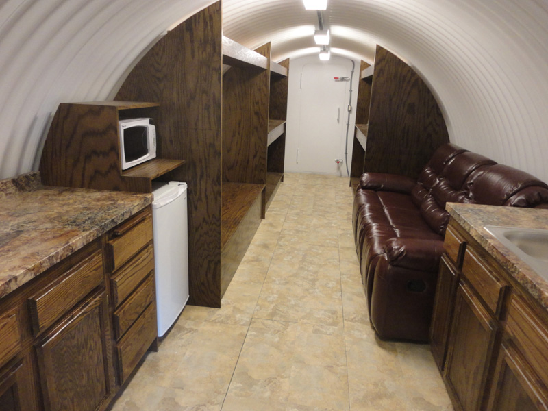 The following photographs illustrate our standard 39' stock 8-9 man shelter with a painted and finished interior. All corrugated pipe models include NBC air filtration system, blast hatch, escape hatch, beds, kitchen, under floor storage, under-bed storage, sink, refrigerator, microwave and linoleum floors.
