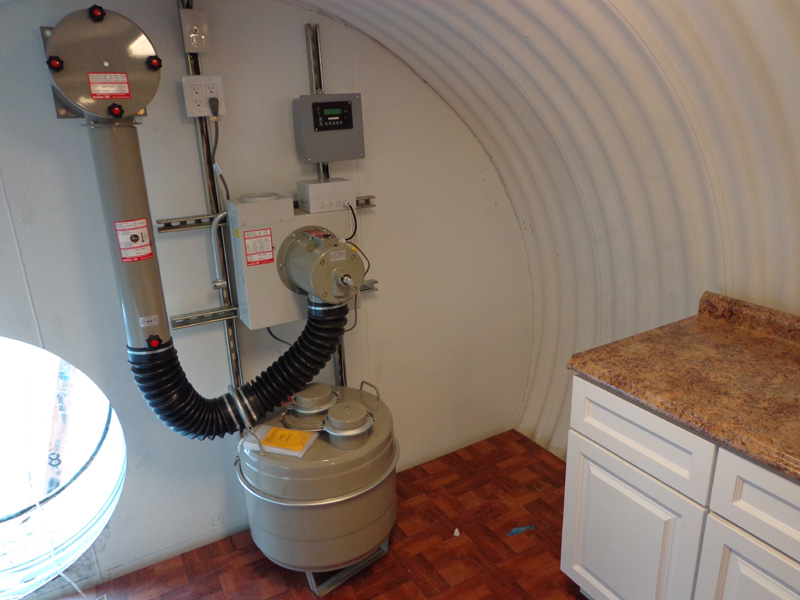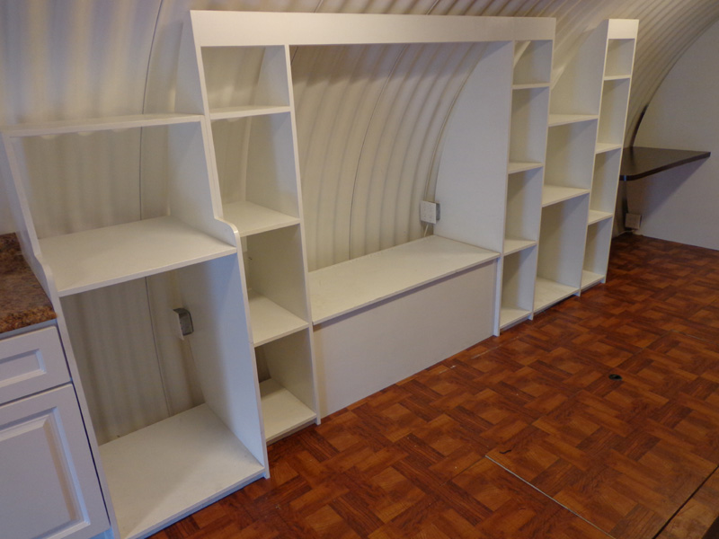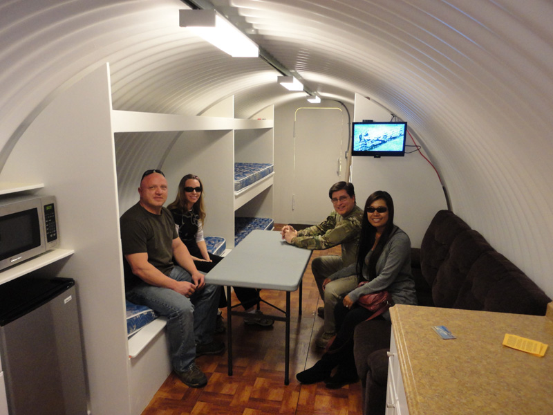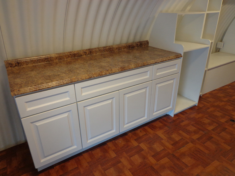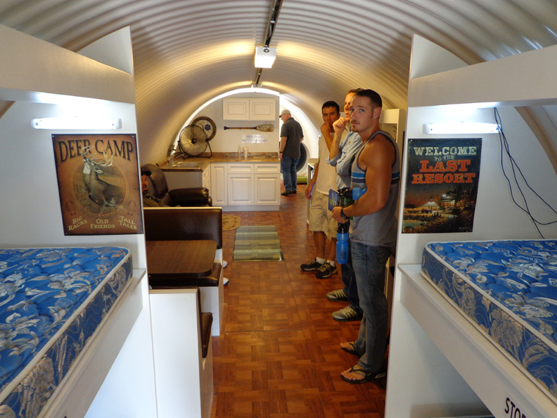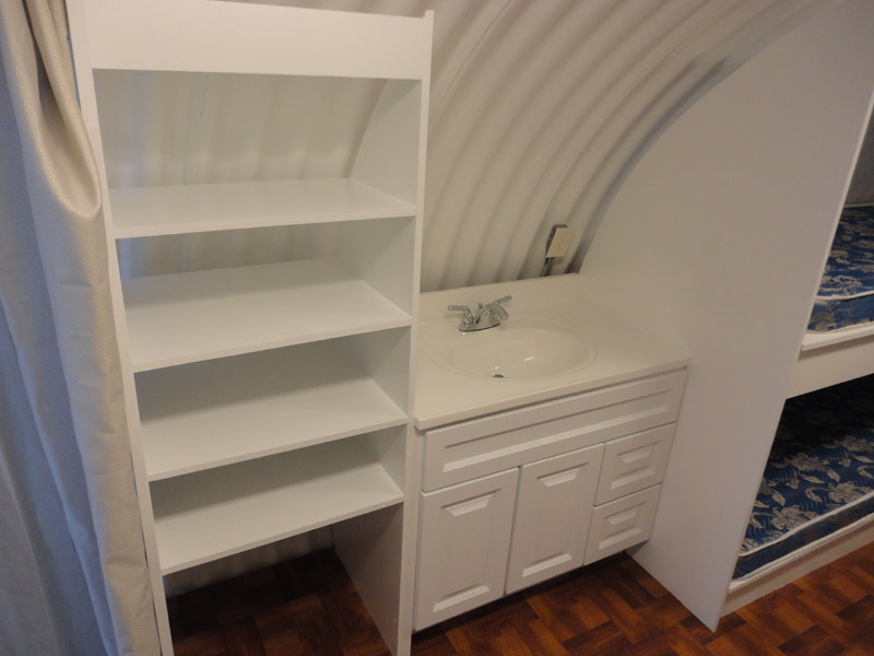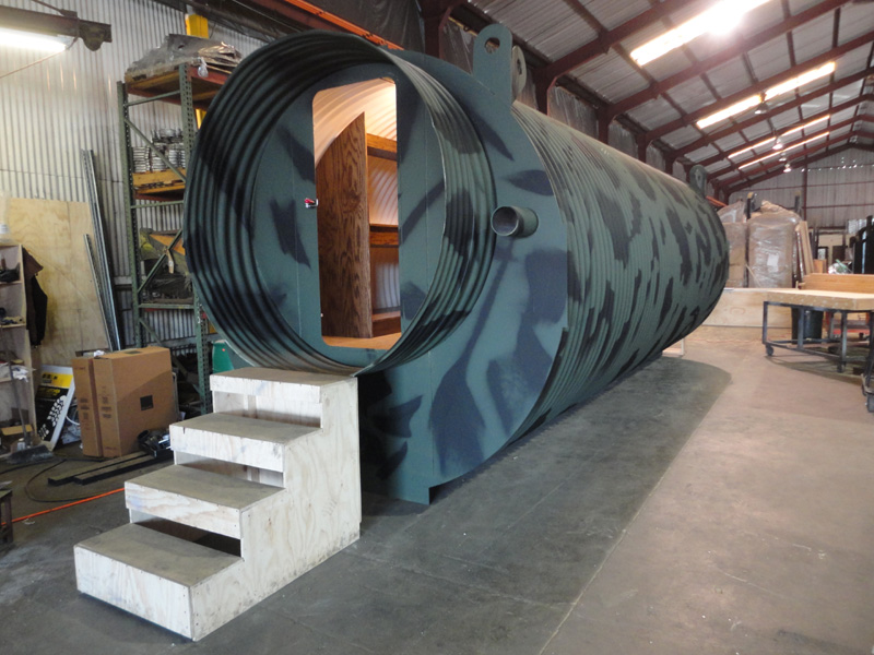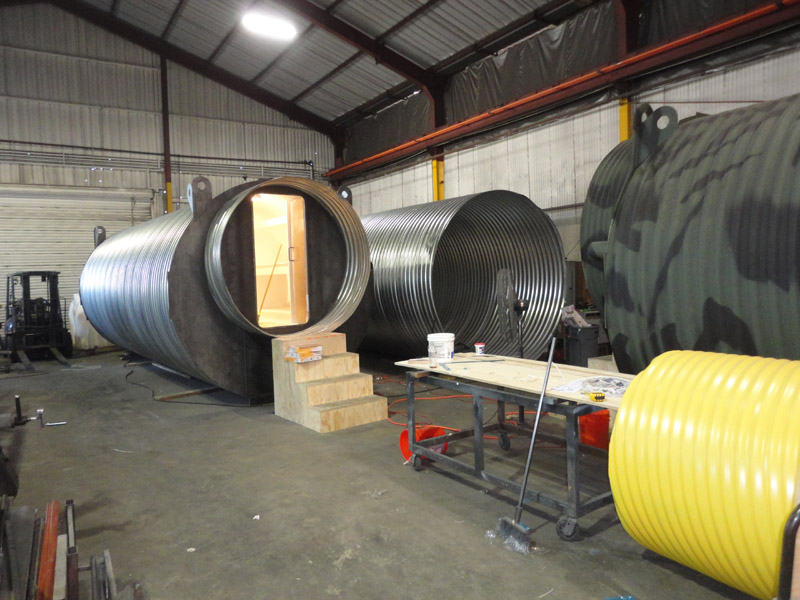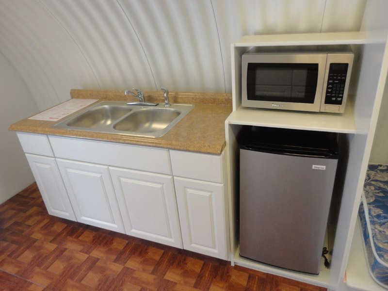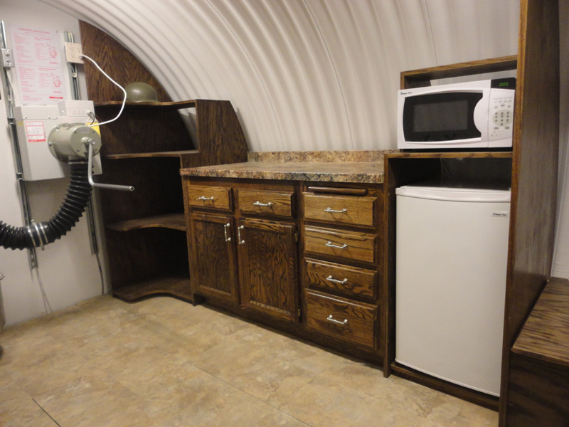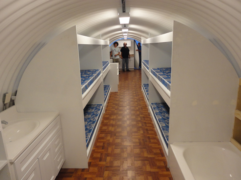 The following photographs illustrate our standard 39' stock 8-9 man shelter with a painted and finished interior. All corrugated pipe models include NBC air filtration system, blast hatch, escape hatch, beds, kitchen, under floor storage, under-bed storage, sink, refrigerator, microwave and linoleum floors.