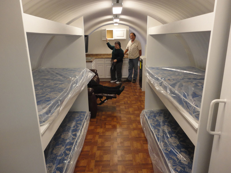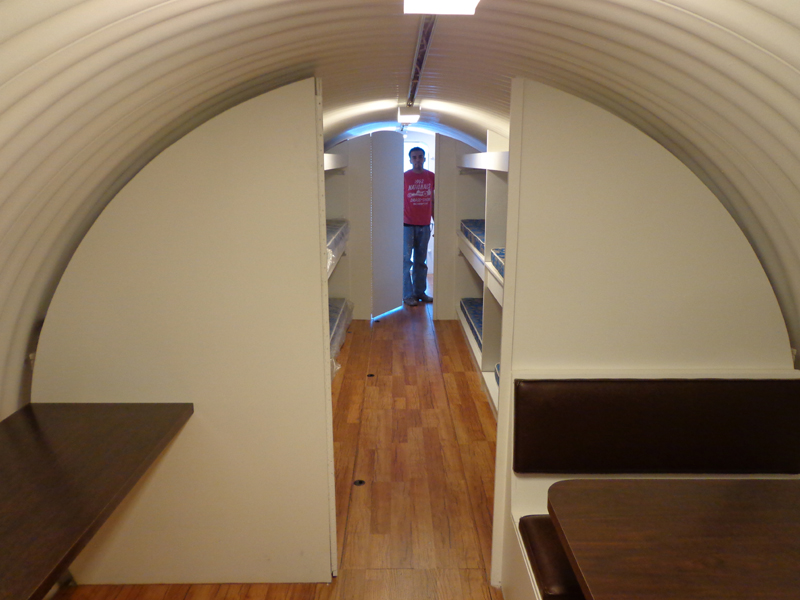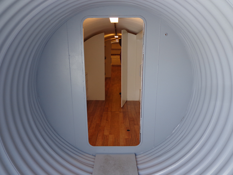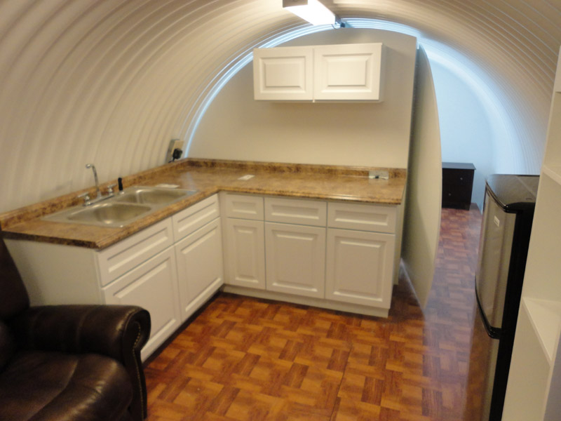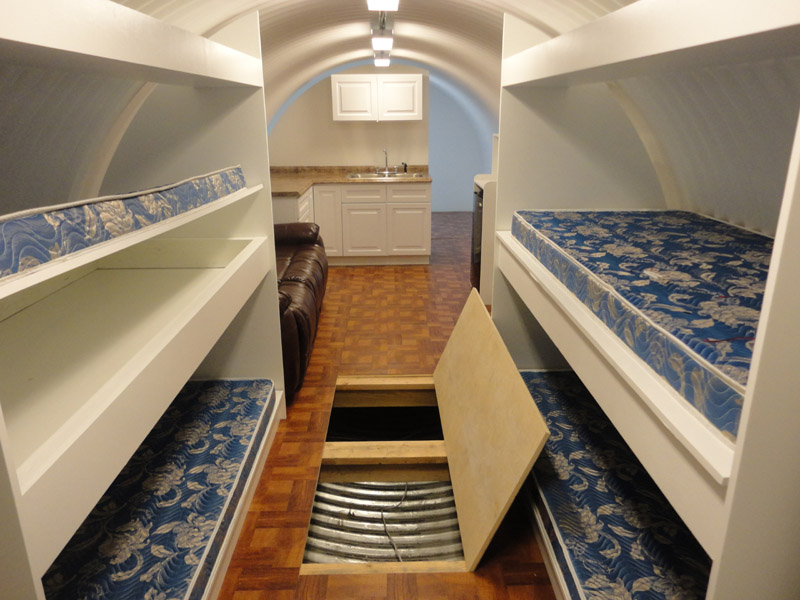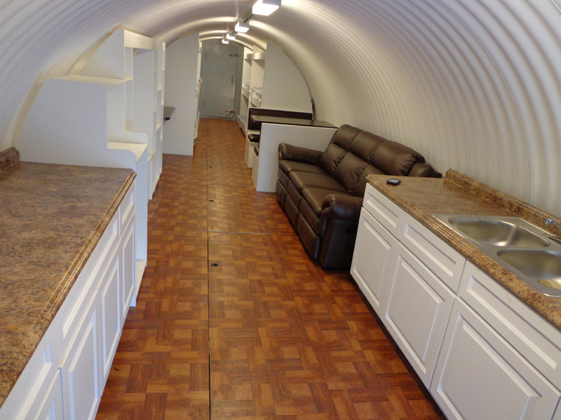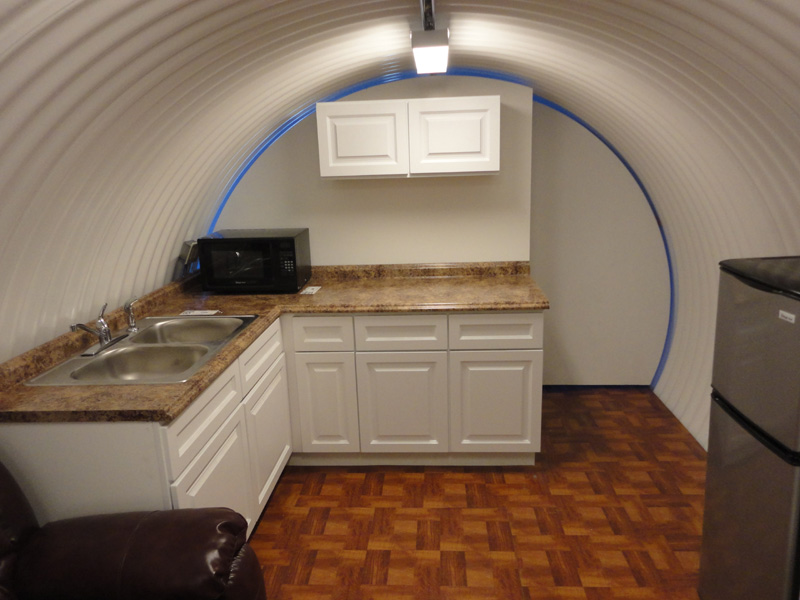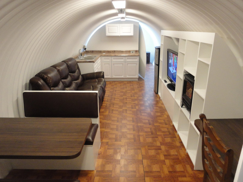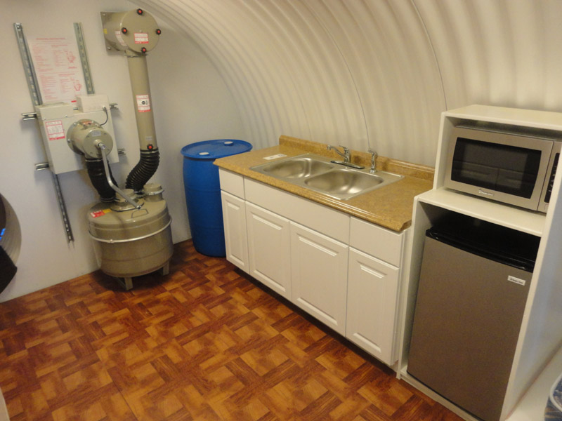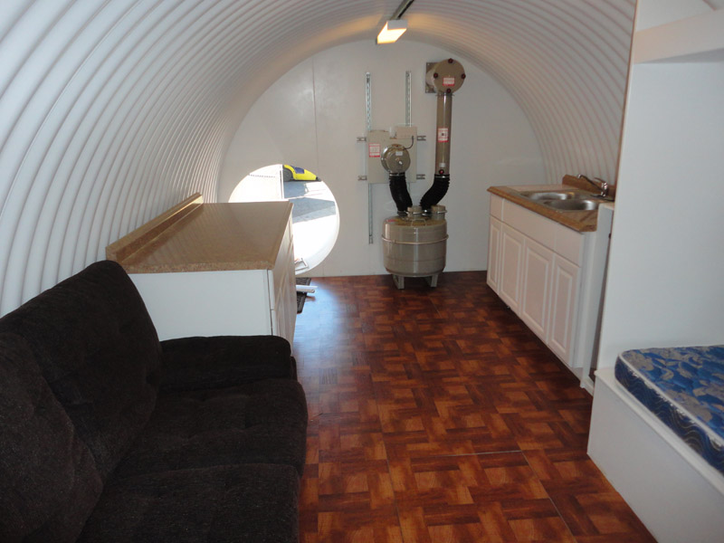 The following photographs illustrate our standard 24' 6" stock 5-6 man shelter with a painted and finished interior. All corrugated pipe models include NBC air filtration system, blast hatch, escape hatch, beds, kitchen, under floor storage, under-bed storage, sink, refrigerator, microwave and linoleum floors.