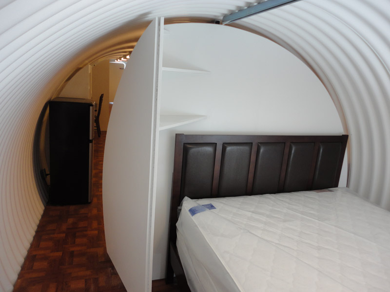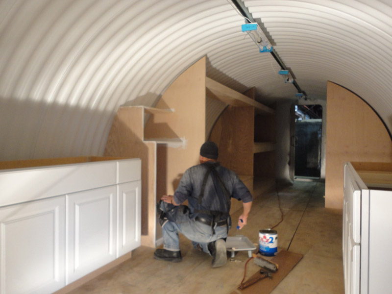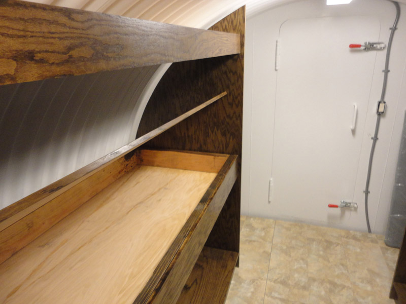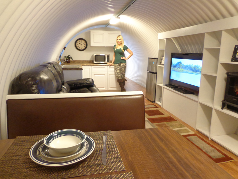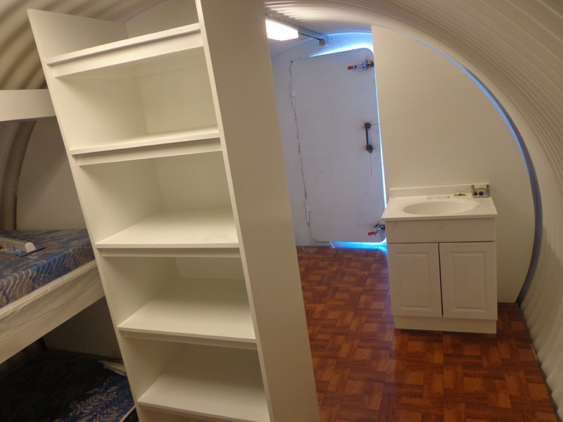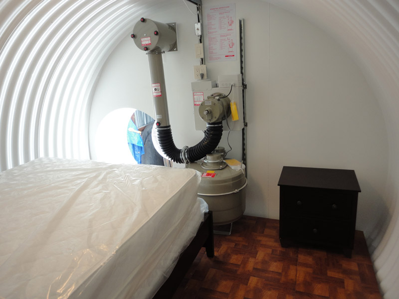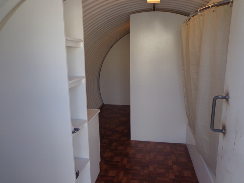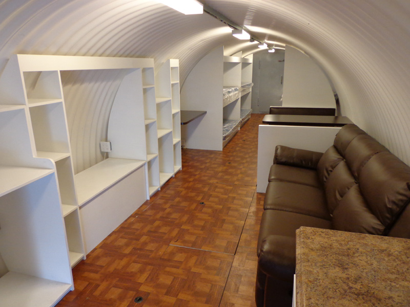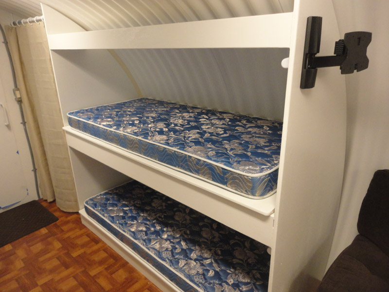 The following photographs illustrate our standard 24' 6" stock 5-6 man shelter with a painted and finished interior. All corrugated pipe models include NBC air filtration system, blast hatch, escape hatch, beds, kitchen, under floor storage, under-bed storage, sink, refrigerator, microwave and linoleum floors.