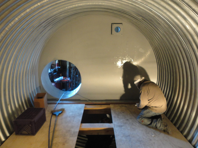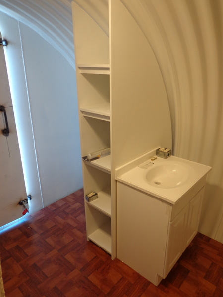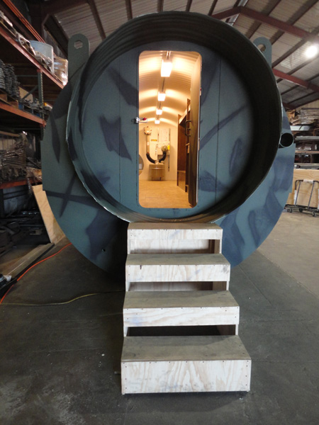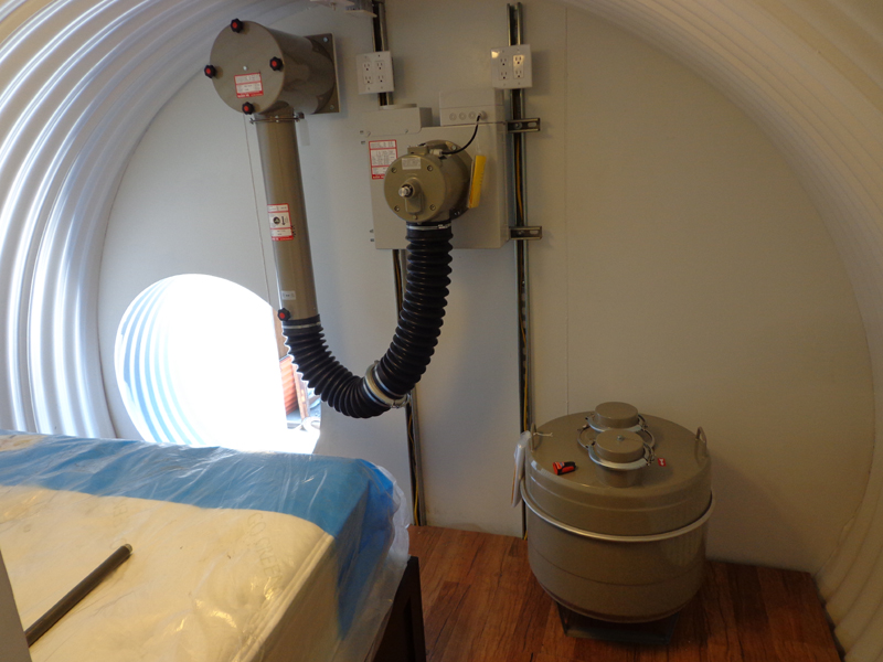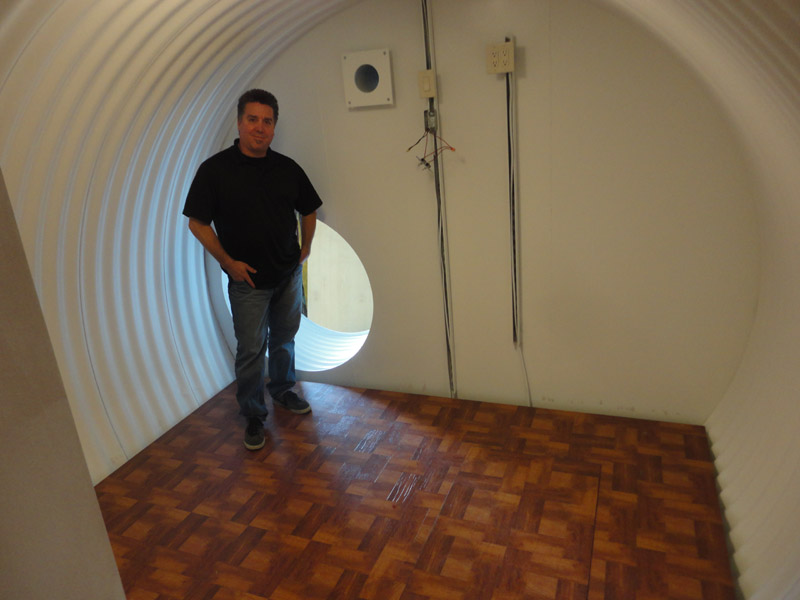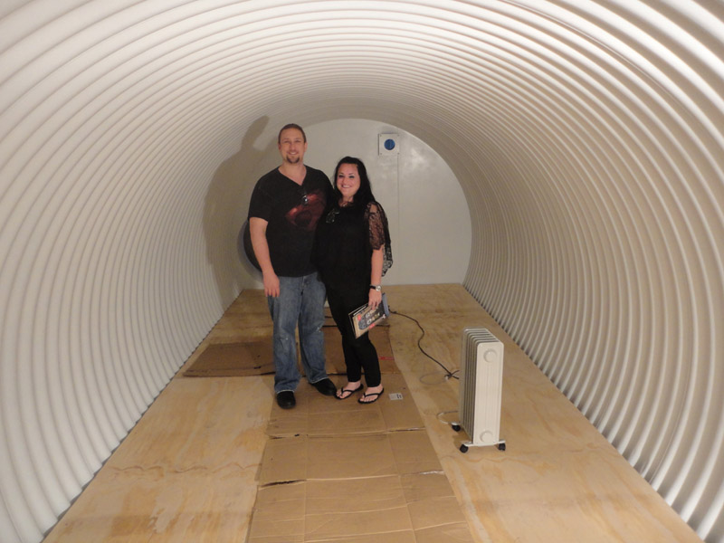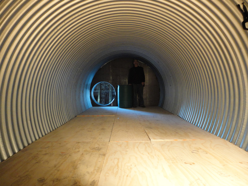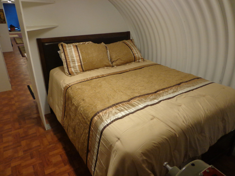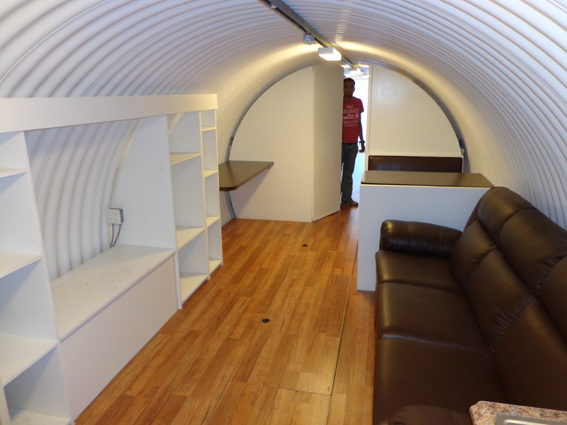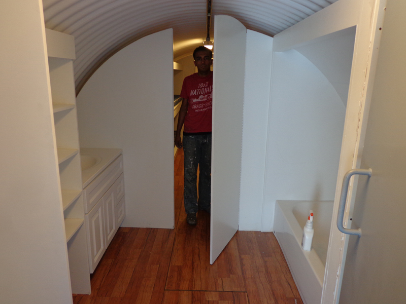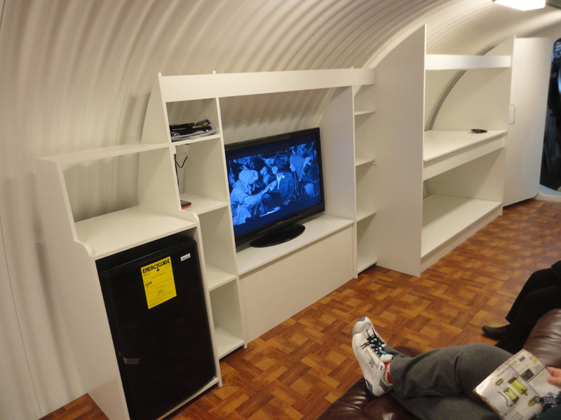 The following photographs illustrate our standard 24' 6" stock 5-6 man shelter with a painted and finished interior. All corrugated pipe models include NBC air filtration system, blast hatch, escape hatch, beds, kitchen, under floor storage, under-bed storage, sink, refrigerator, microwave and linoleum floors.