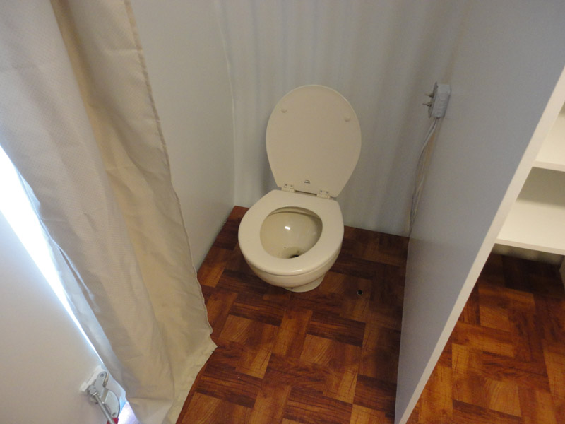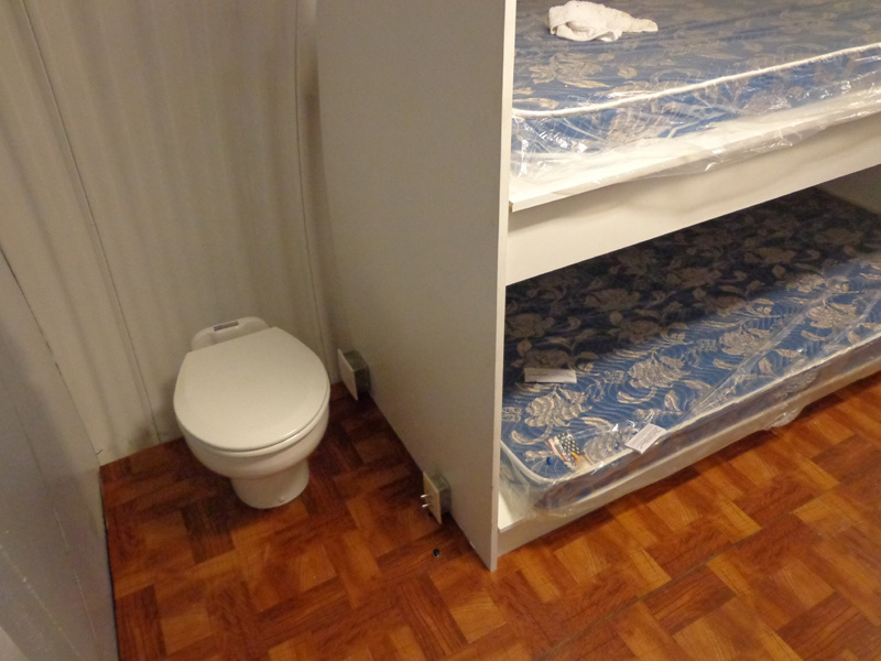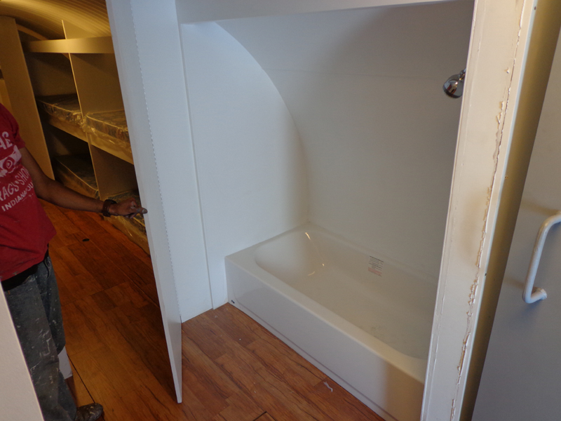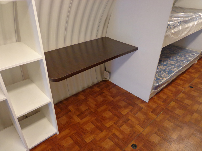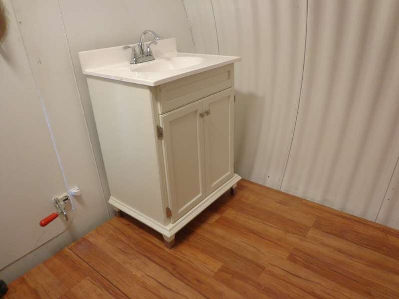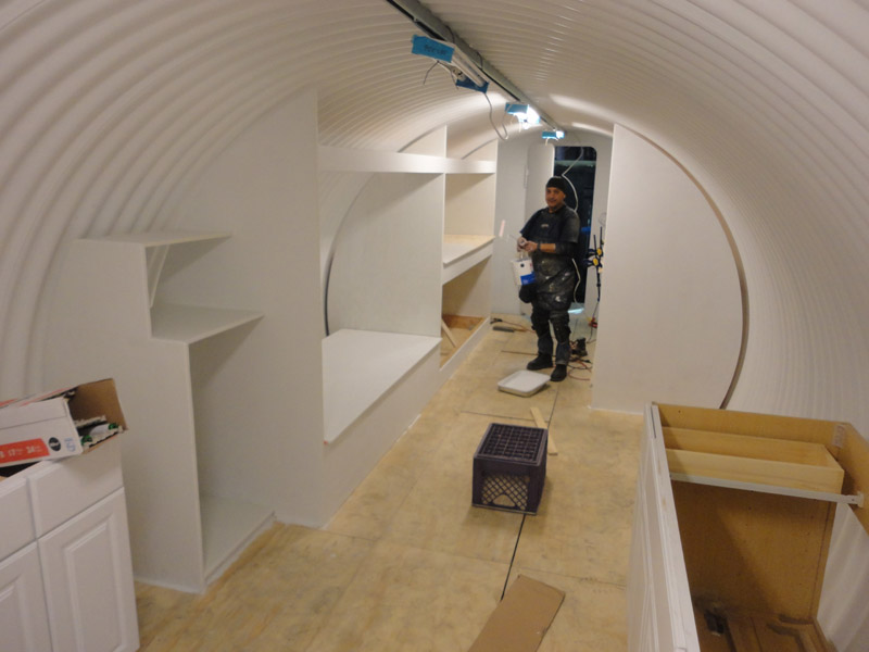 When your shelter gets to this point here your options are to decide whether you want painted walls and whether you would like linoleum floors. Bunk beds will be arranged around your counters and your couch.