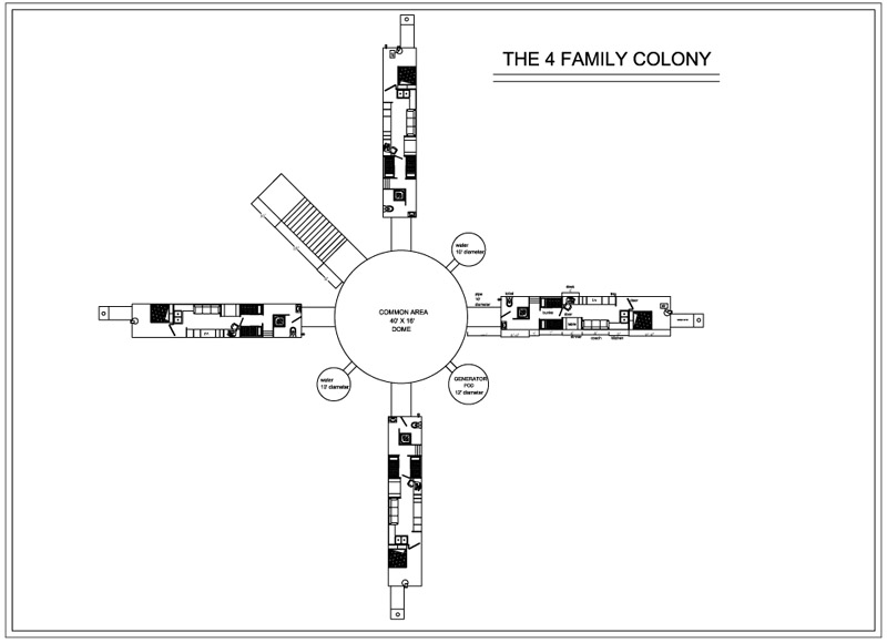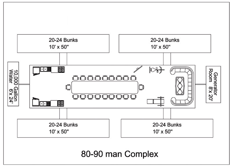 This is our spacious 10' x 40' "Lodge". It has a master bedroom with a Queen size bed on one end and four bunk beds on the opposite end of the shelter with a toilet room. In the middle is a spacious den with room fora reclining couch and entertainment center with room for a 46" big screen tv and electric fire place. This shelter also has a four man dinette and a 48" desk you can use as a command center to hold your HF and VHF radios plus your monitor for your surveillance cameras. Also it has a large 6' x 6' kitchen with cabinets, sink, refrigerator and microwave.