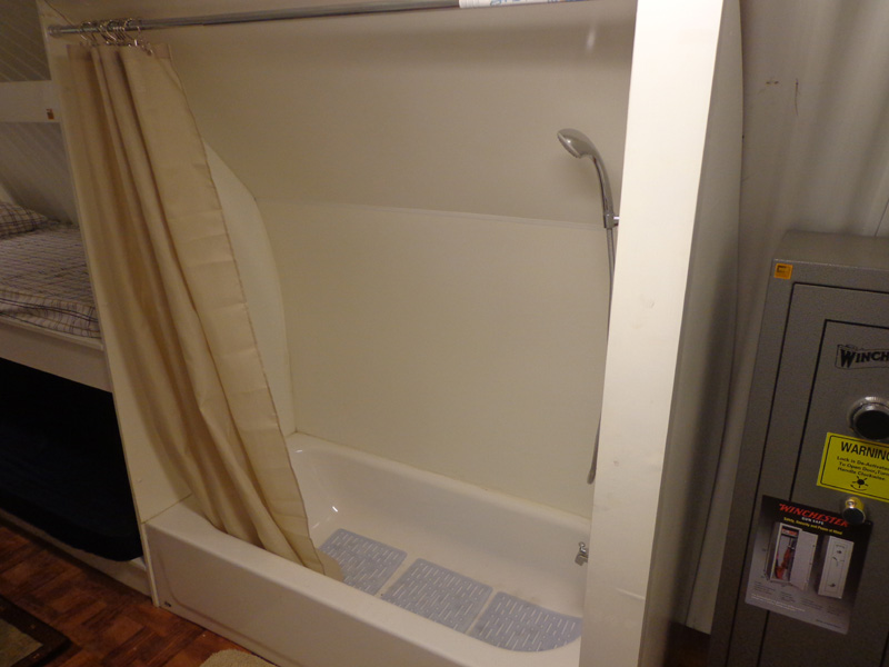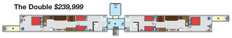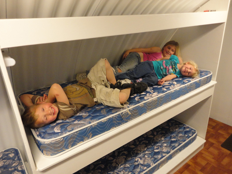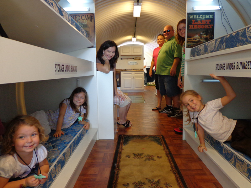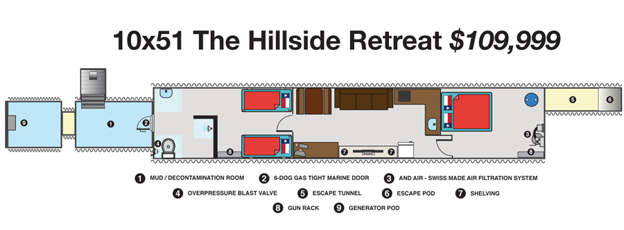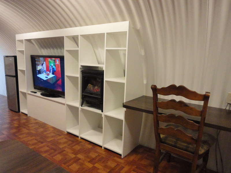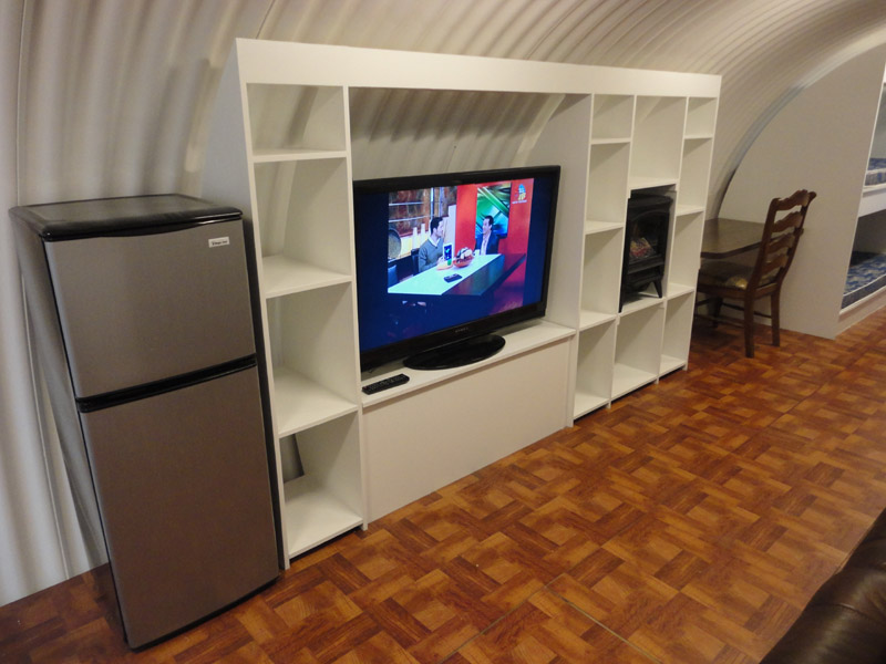 This is our largest stock model, the 10' x 51' underground home. It has a master bedroom with a Queen size bed on one end and 6 bunk beds on the opposite end of the shelter with a door that closes so guests can go to sleep while the others sit up and watch tv in the den. The shower and toilet are behind a private bulkhead. In the middle is a spacious den with a 4 person fixed dinner table, 48" desk and a reclining couch and entertainment center with 46" big screen tv that sits on top of a large electric fireplace. This shelter has a larger kitchen with cabinets, sink, refrigerator and microwave. Custom Floor plans available.