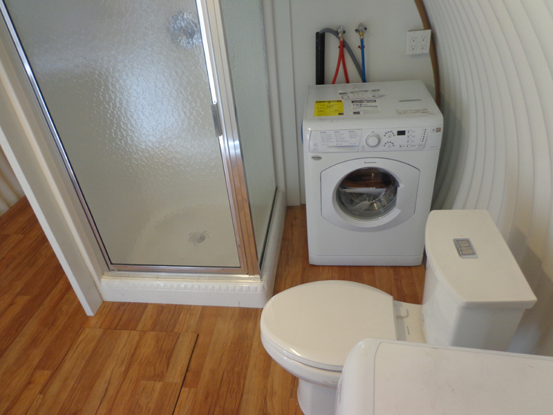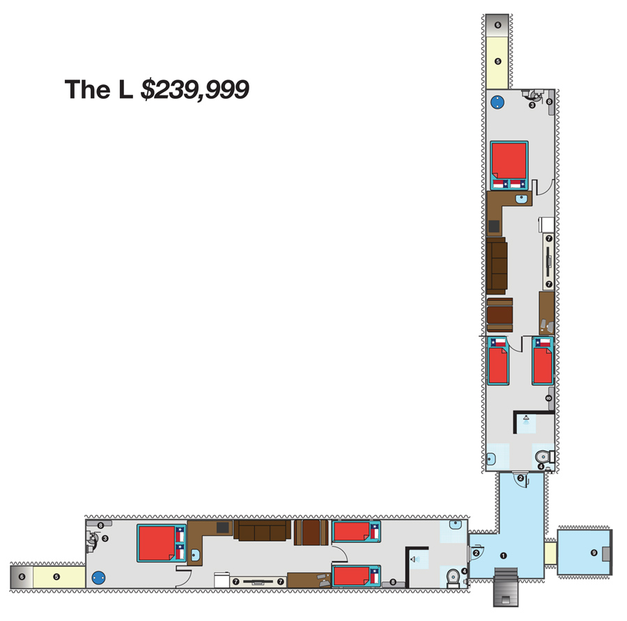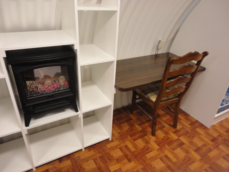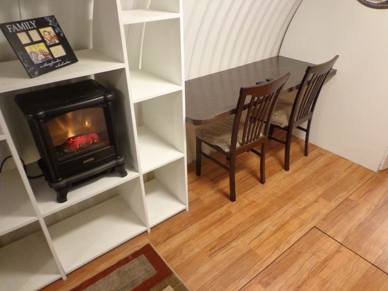 This is our largest stock model, the 10' x 51' underground home. It has a master bedroom with a Queen size bed on one end and 4 bunk beds on the opposite end of the shelter with a door that closes so guests can go to sleep while the others sit up and watch tv in the den. The walk-in shower and toilet are behind a private bulkhead. In the middle is a spacious den with a 4 person fixed dinner table, 60" desk and a reclining couch and entertainment center with 46" big screen tv that sits on top of a large electric fireplace. This shelter has a larger kitchen with cabinets, sink, refrigerator, microwave, and laminated oak flooring. Custom Floor plans available.
