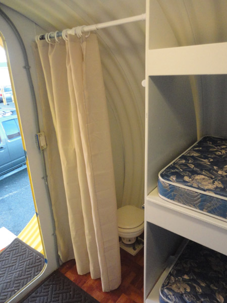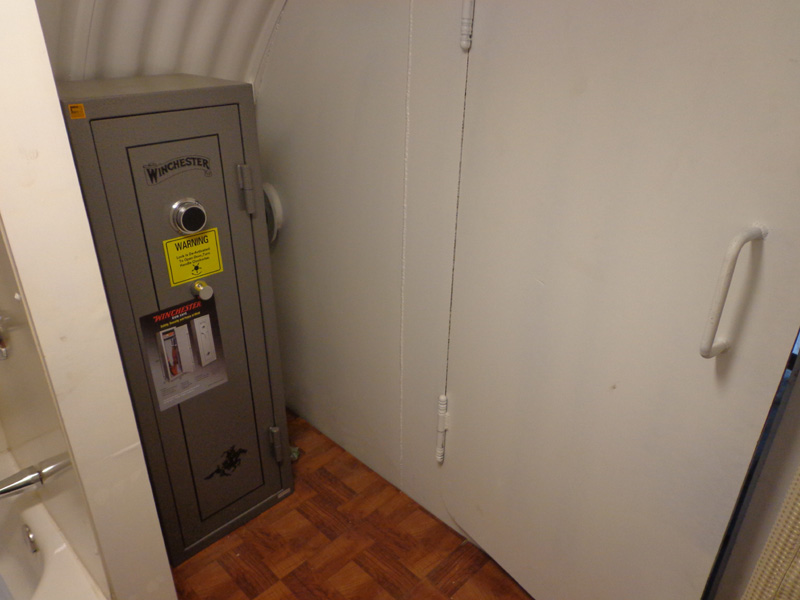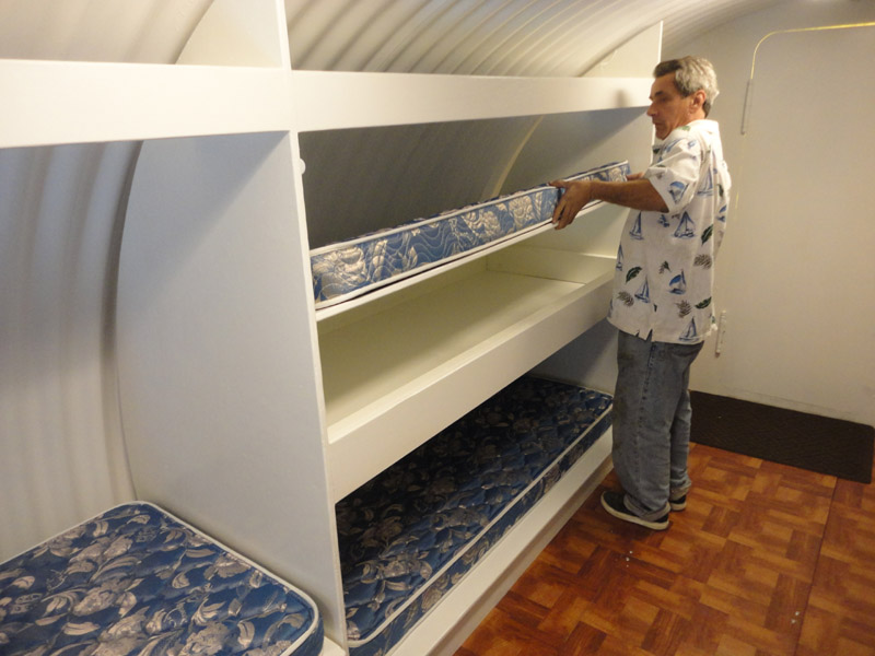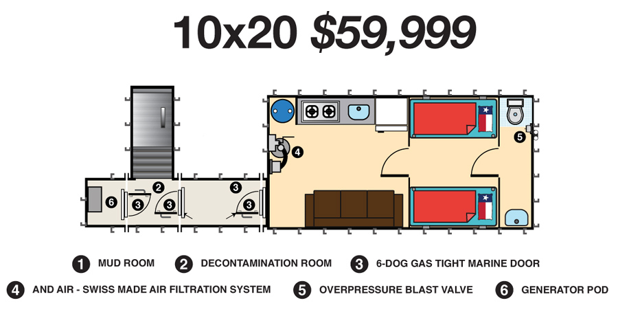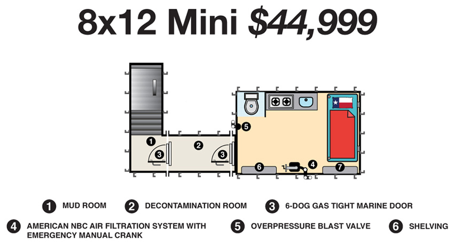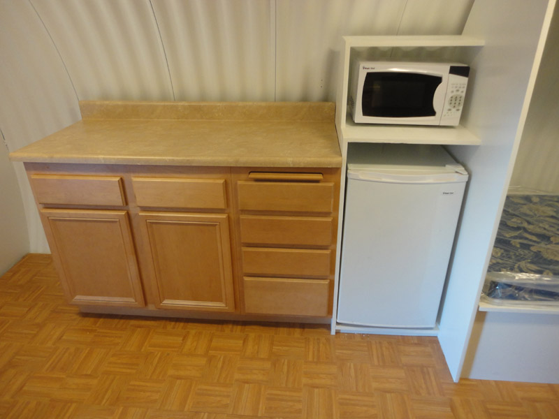 The following photographs illustrate our standard 24' 6" stock 5-6 man shelter with a painted and finished interior. This size and model start at $49,900 including air filtration blast hatch, escape hatch, beds, kitchen, under floor storage, under-bed storage, sink, refrigerator, microwave and linoleum floors.