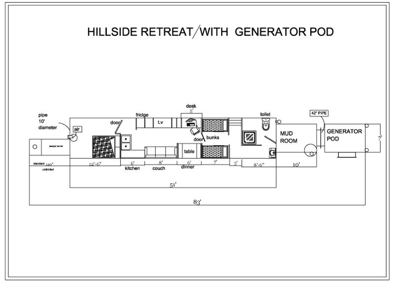 The mud room is a piece of 7' diameter pipe 10' long that attaches to the main living quarters. It serves several purposes. 1. It gives you an air-lock between the surface hatch and the interior door 2. If you have to spend a long time underground, it can serve as a trash room. 3. It serves as a shower room 4. It can serve as a temporary morgue if somebody dies 5. You can run a generator in there 6. You can store more materials in there 7. It allows you to walk into your shelter instead of crawling into your shelter. 8. It gives you a place for your dog to do their business if you can't go to the surface.
