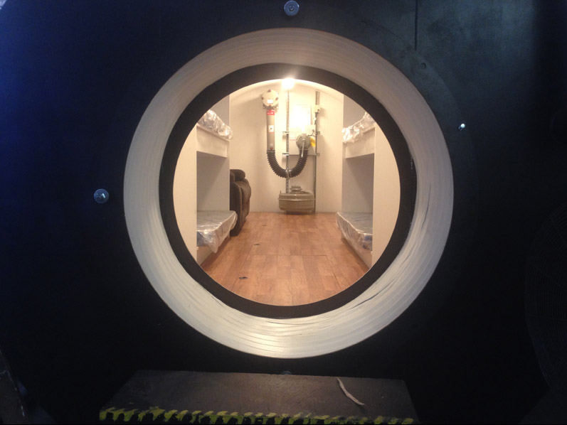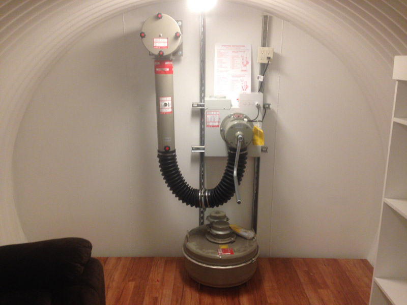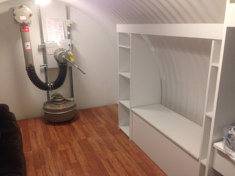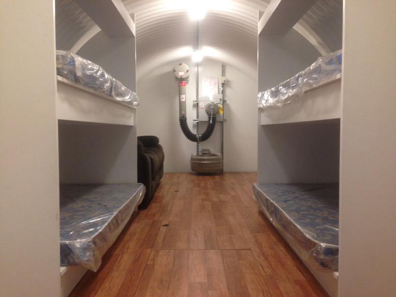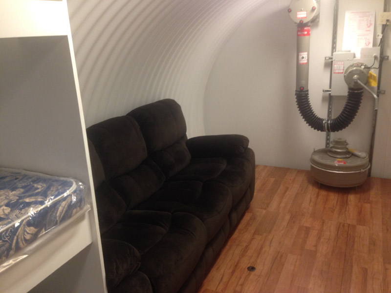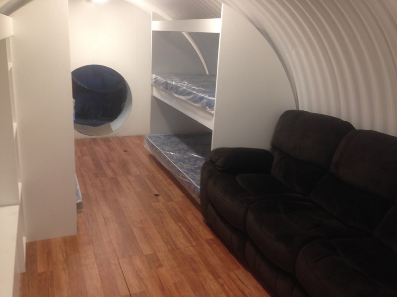 The Spend-a-Night Tornado Shelter is designed to give the family a place to spend the night underground when tornados are in the area and the family will just feel better if they can go to sleep in the comfortable over-night tornado shelter. The size shown below is the standard 10' diameter x 20' long for $29,900 without the interior built out or for $33,900 with the interior built as shown which includes 4 bunk beds, an entertainment center, and laminated oak floors. Just add a couch and four twin matresees and a 46" flat screen TV and now you not only have a tornado shelter but you have a guest room, a play room for the kids, and once you add your NBC filtration system you have a bomb shelter in the backyard as well. To add an NBC air filtration system add $6,000 to the price