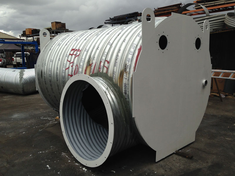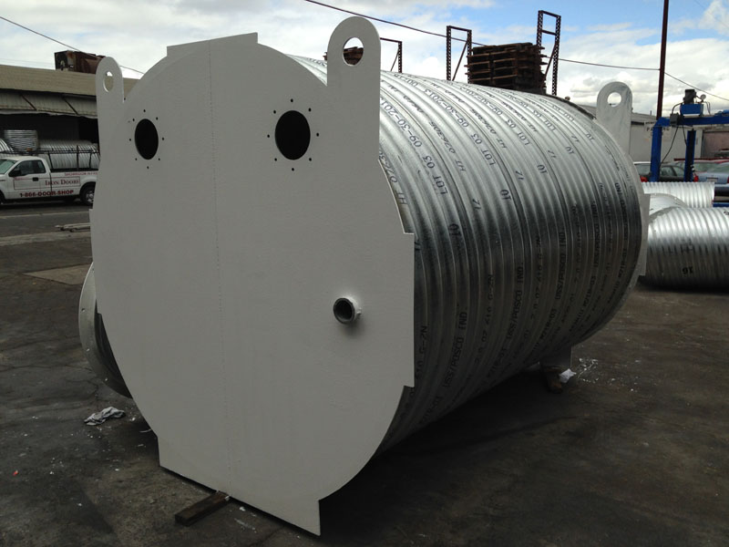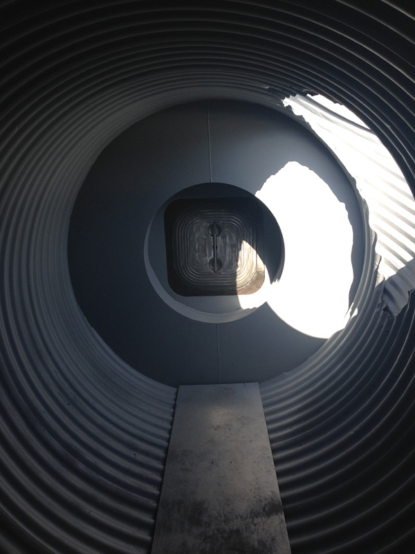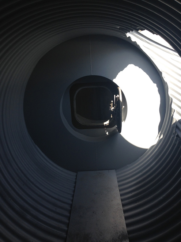 The Bolt-on Generator Pod connects to the mud room of the corregated pipe shelters. The water-tight hatch allows you to access the generator inside the pod from underground. The dimensions are 7' diameter by 10' long. The entrance pipe to place the generator is 48" in diameter.